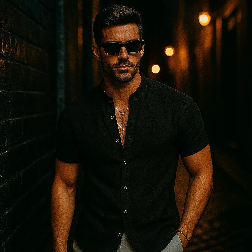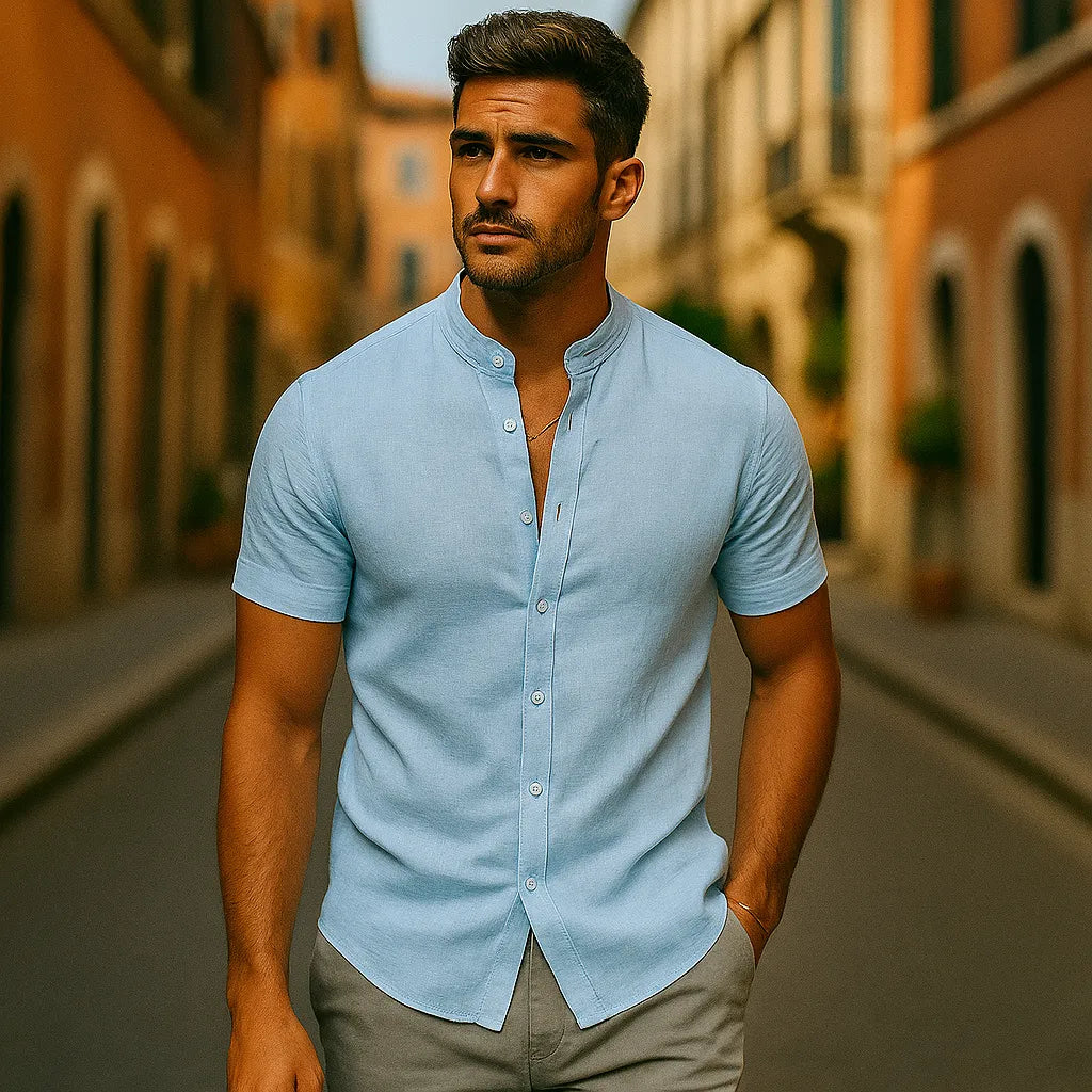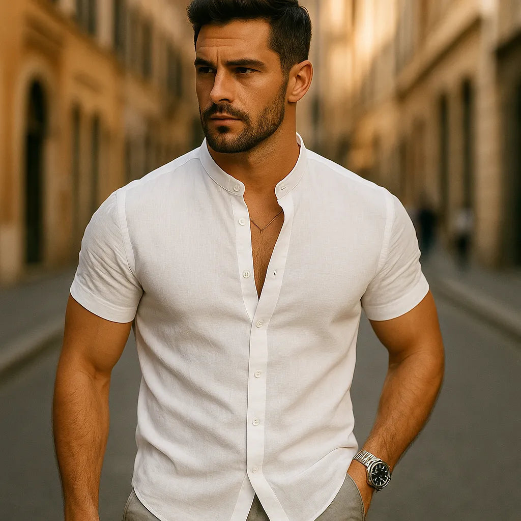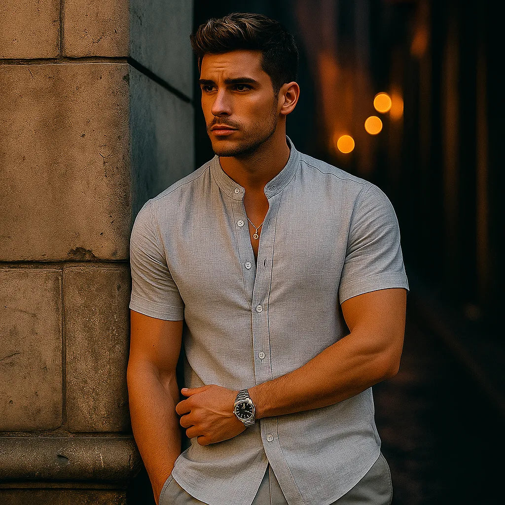 Blijf koel en zelfverzekerd in dit lichtgewicht overhemd van linnenmix, ontworpen met een relaxte V-hals en korte mouwen. De ademende stof en het strakke silhouet maken het een veelzijdige keuze voor zomerdagen, of je nu op het strand bent of in de stad.