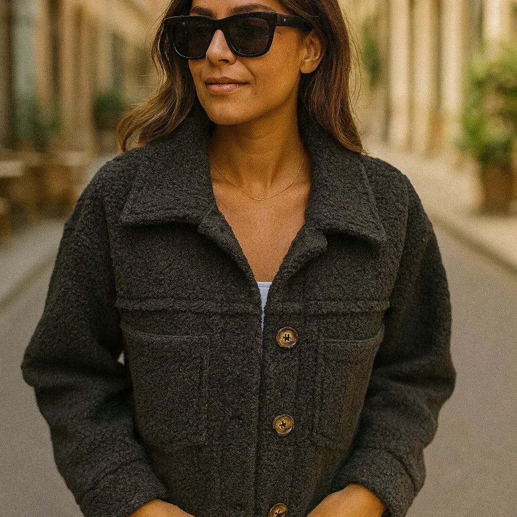 Lightweight yet cozy, it’s ideal for layering over sweaters, jeans, or dresses — bringing the perfect mix of structure and softness.