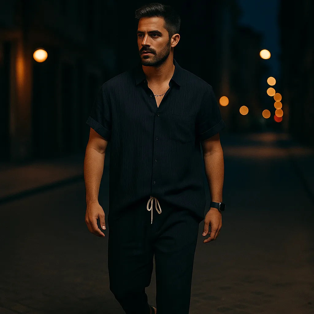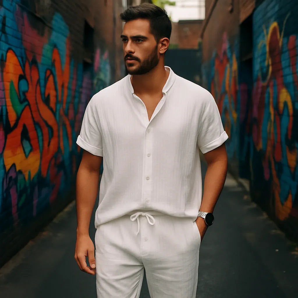 This 2-piece summer set combines a striped stand-collar shirt with drawstring pants for the ultimate in comfort and style. Lightweight, breathable, and easy to wear—perfect for beach days, vacations, or casual weekends.